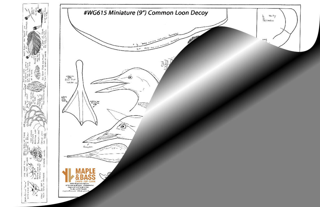 Flat-bottom decoy of a 9" miniature Common Loon. Body is approximately 9" long. Uses 8mm loon eyes or red eyes. Includes 5 options for head position and open/closed bill options. Also has a few body modification options.