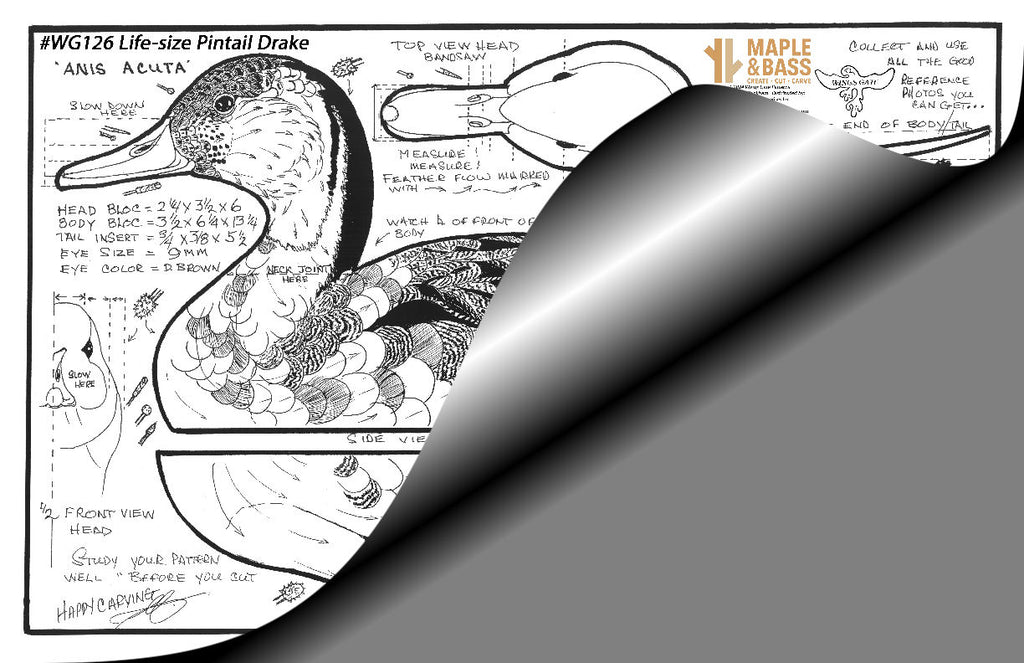 Flat-bottom decoy of a Drake Northern Pintail. Body is approximately 13" long (excluding tail insert). Has information on inserting the tail. Uses 9mm dark brown eyes.
