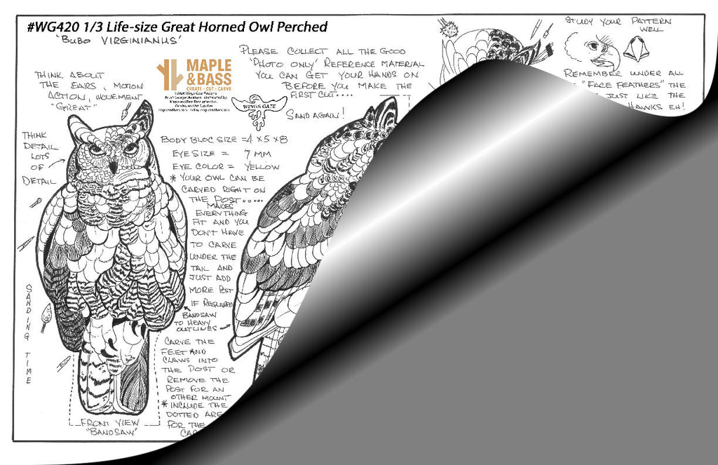 1/3 Lifesize Great Horned Owl (perched). Body approximately 8" long. Uses 8mm yellow eyes. As with all Wings Gate patterns there is a lot of information about this carving included with the pattern, including the option to carve the bird on a stump as one piece.