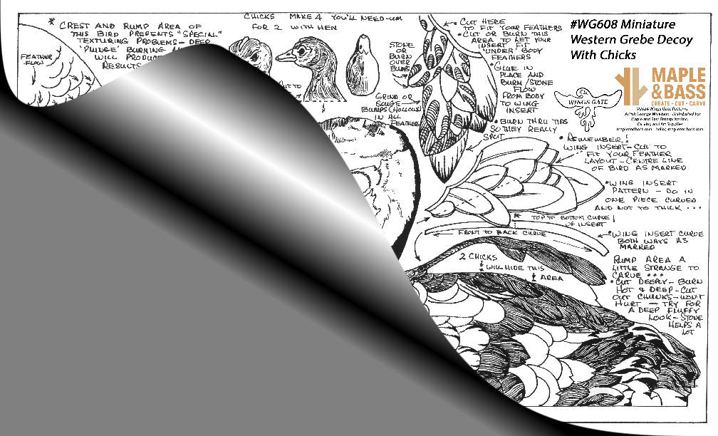 Flat-bottom miniature decoy of a Western Grebe with chicks in its back. Body is approximately 7" long. Uses 6 or 7mm red Loon eyes.